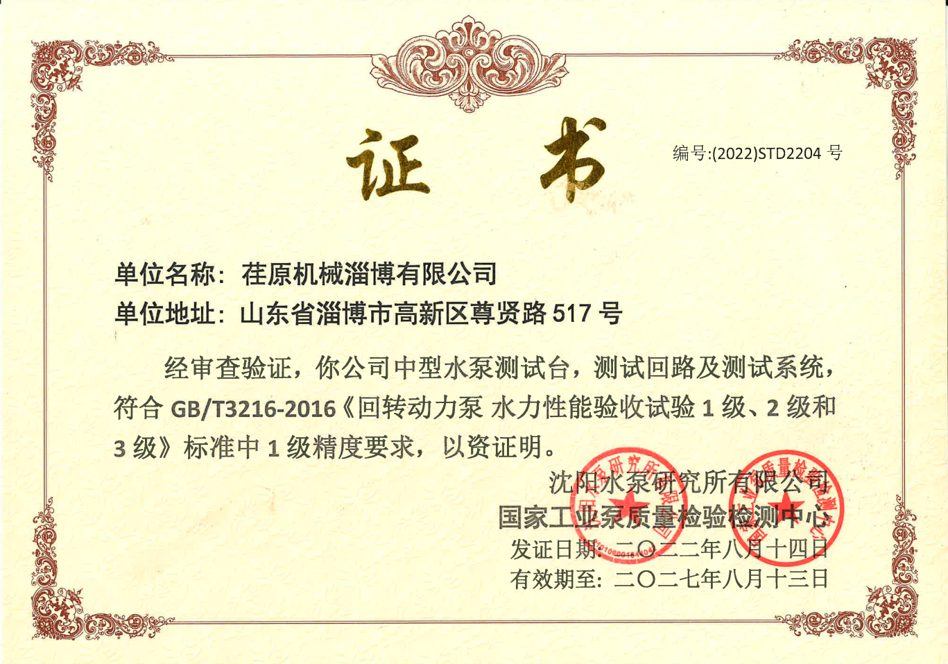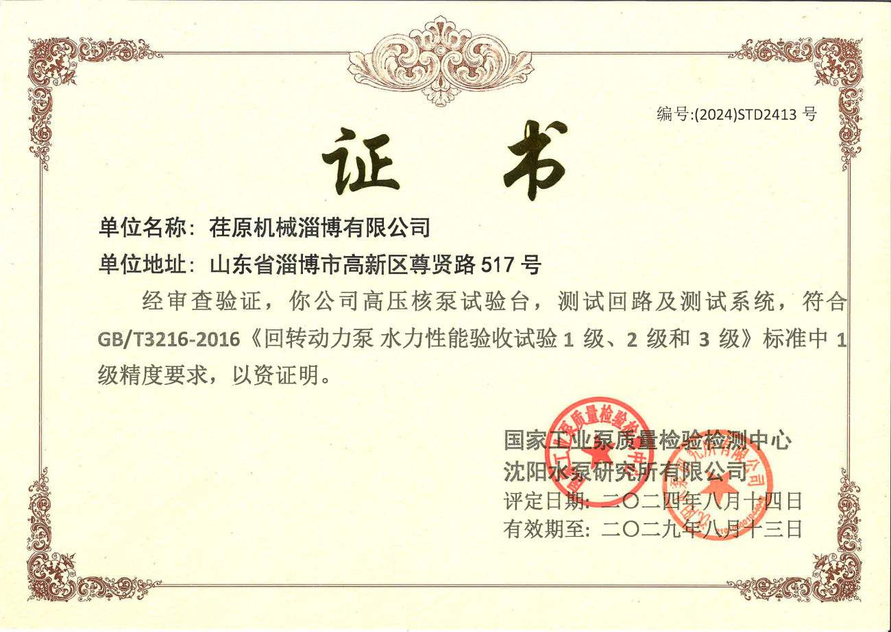 • 中型水泵試驗臺及測試系統(tǒng)1級精度證書