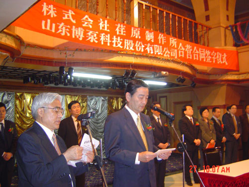 新聞中心 2005年4月27日,在博山萬杰國際大酒店山東博泵科技股份有限公司與日本株式會社荏原制作所正式簽署了注冊資本1100萬美元的合營公司――荏原博泵有限責(zé)任公司。該公司的建立將通過引進(jìn)世界最大的泵企業(yè)――日本株式會社荏原制作所的先進(jìn)技術(shù),加快大型泵、高壓泵國產(chǎn)化進(jìn)程,建成具有國際競爭力的一流企業(yè)。為中國水電、核電及超臨界火電項目,為南水北調(diào)等大型水力工程提供高質(zhì)量、高技術(shù)含量的一流泵產(chǎn)品,提升中國機(jī)械工業(yè)技術(shù)、質(zhì)量水平,促進(jìn)產(chǎn)品更新?lián)Q代,為中國電力、冶金、水力事業(yè)的發(fā)展乃至中國國民經(jīng)濟(jì)的發(fā)展做出應(yīng)有的貢獻(xiàn)。
