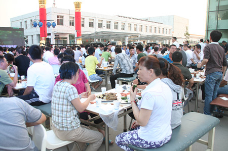 下午5點(diǎn),在夕陽(yáng)的映照中,公司辦公樓前,忙碌的員工穿梭在會(huì)場(chǎng),辦公樓南面已搭建好舞臺(tái),碩大的LED屏矗立在舞臺(tái)上。舞臺(tái)兩側(cè)各豎立著兩個(gè)團(tuán)結(jié)柱。舞臺(tái)前的空地上,已擺放好63張桌子,每張桌子配放6把椅子。桌子上,豐盛的飯菜已放好,靠西邊的草坪旁,是備好的新鮮的青島扎啤。